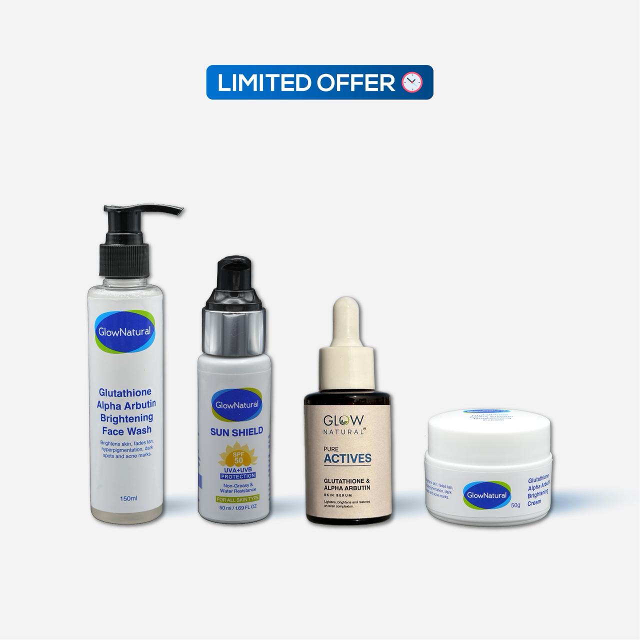 A complete, dermatologist-inspired routine powered by Glutathione + Alpha Arbutin to visibly brighten skin, reduce pigmentation, and protect your glow all summer long.